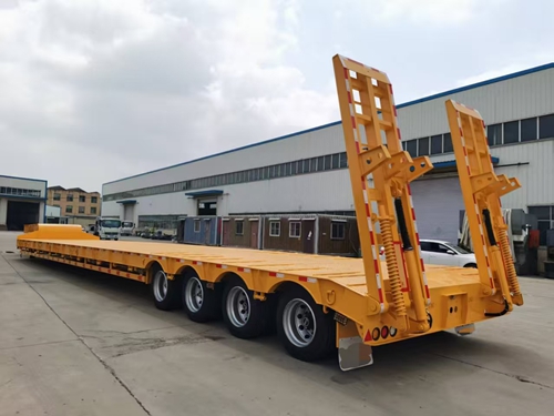 采用凹梁式或井型車(chē)架設(shè)計(jì),前段為鵝頸牽引結(jié)構(gòu),中段為低貨臺(tái),后端為輪架。這種布局使貨臺(tái)離地高度顯著降低(通常不超過(guò)1150mm),重心下移提升了運(yùn)輸穩(wěn)定性,尤其適合重型機(jī)械、軌道車(chē)輛等不可拆解大件貨物的運(yùn)輸。